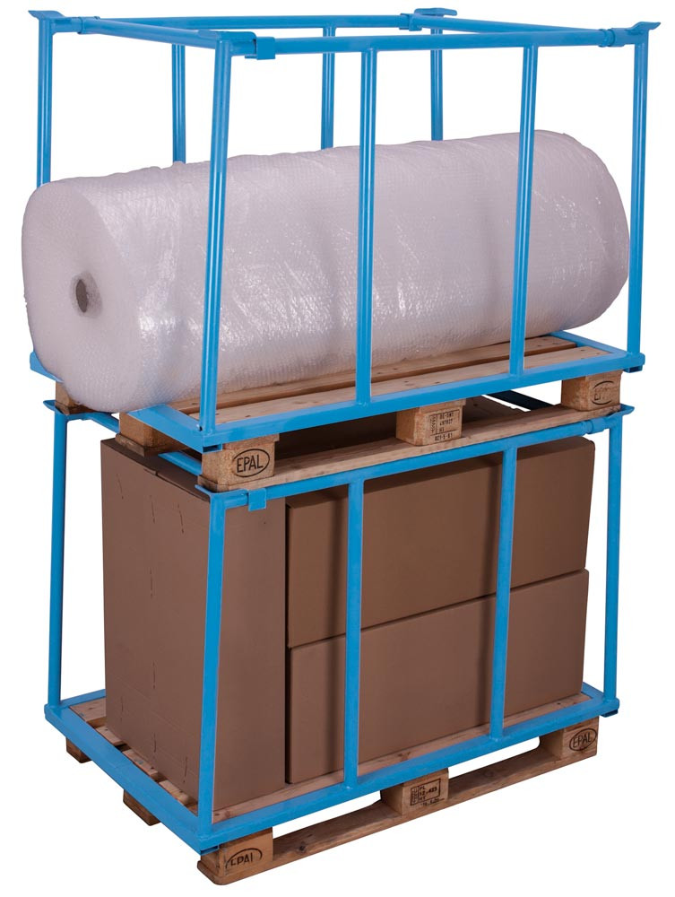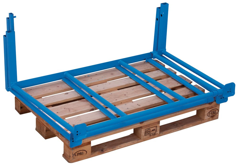 ∙ Stapelbar ∙ Für die optimale Nutzung der Palettenoberfläche ∙ Schnell montiert und bei Nichtgebrauch platzsparend gelagert ∙ Stabile Stahlkonstruktion mit senkrechten Streben aus geschweißtem Stahl für höchste Beanspruchungen ∙ Farbe RAL 5012 lichtblau · Auf Anfrage auch in RAL 7016 anthrazitgrau lieferbar