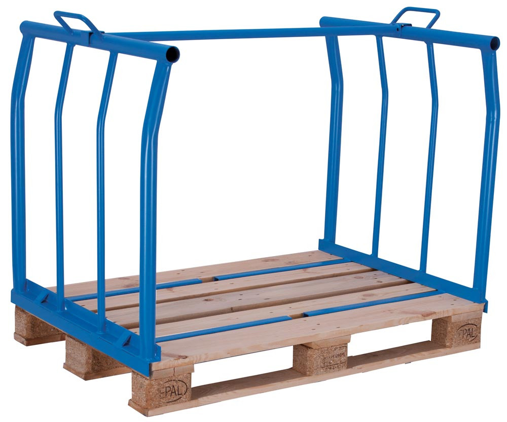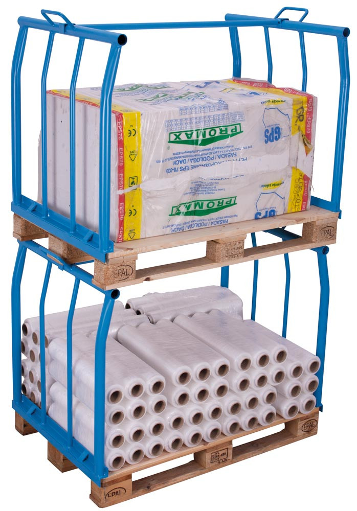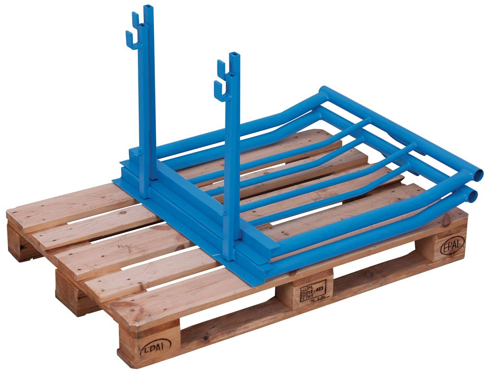 ∙ Stapelbar ∙ Für die optimale Nutzung der Palettenoberfläche ∙ Schnell montiert und bei Nichtgebrauch platzsparend gelagert ∙ Stabile Stahlkonstruktion mit senkrechten Streben aus geschweißtem Stahl für höchste Beanspruchungen ∙ Farbe RAL 5012 lichtblau · Auf Anfrage auch in RAL 7016 anthrazitgrau lieferbar