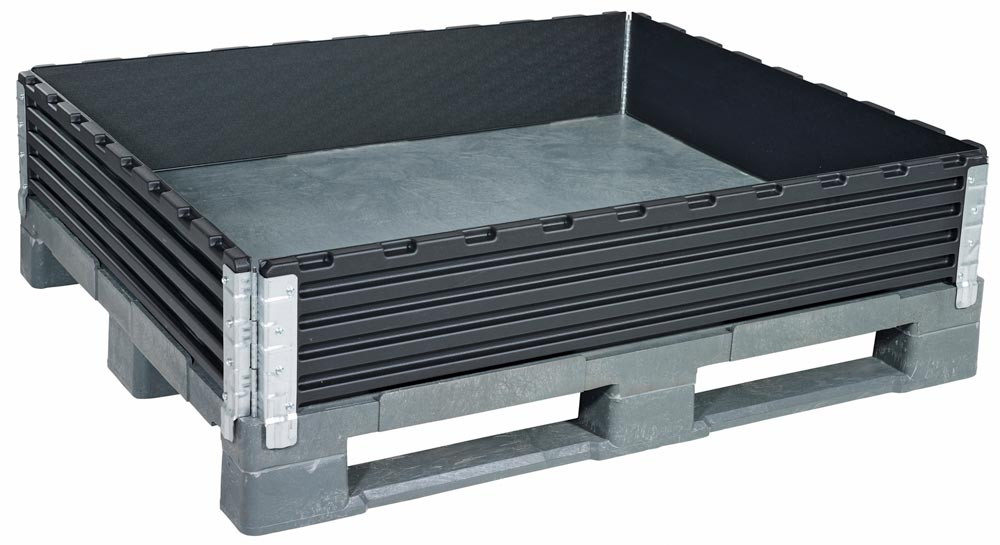 ∙ Aufsatzrahmen für Euro- und Industriepaletten ∙ Aus ABS mit verzinkten Scharnieren ∙ Diagonal klappbar ∙ Rahmenstärke 20 mm ∙ Bei Nichtgebrauch platzsparend zusammenfaltbar ∙ Farbe schwarz ∙ VE 2 Stück