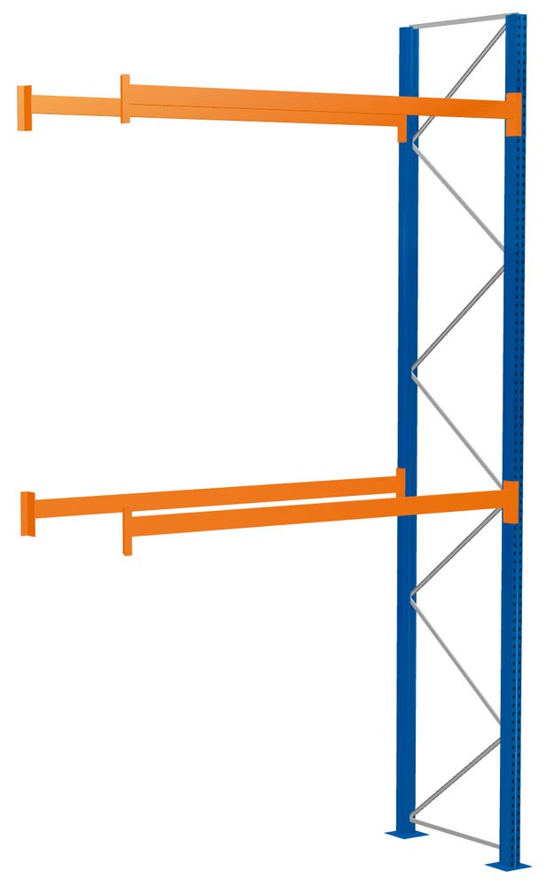 Palettenregal, Anbaufeld, BxTxH 2786x2200x5000 mm, 3 Lagerebenen, Fachlast 1500 kg, Feldlast 4582 kg, Rahmen blau, Holme reinorange E6022064