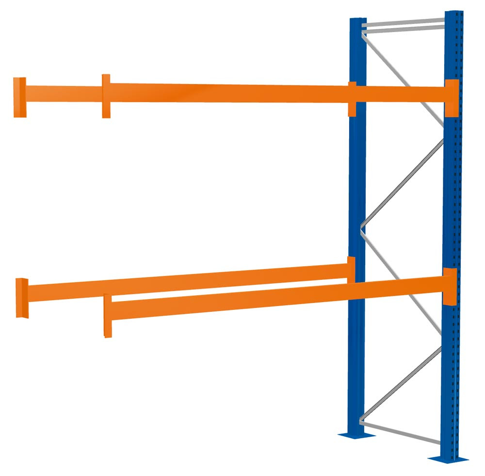 Palettenregal, Anbaufeld, BxTxH 2786x1100x4000 mm, 3 Lagerebenen, Fachlast 1500 kg, Feldlast 5287 kg, Rahmen blau, Holme reinorange E6022063