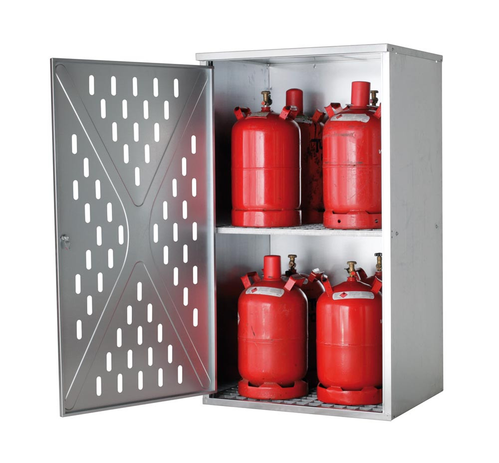 Propangasflaschen-Schrank, verzinkt, mit gelochten Front- und Seitenwänden, mit 1-flügeliger Tür, BxTxH 840x690x1500 mm