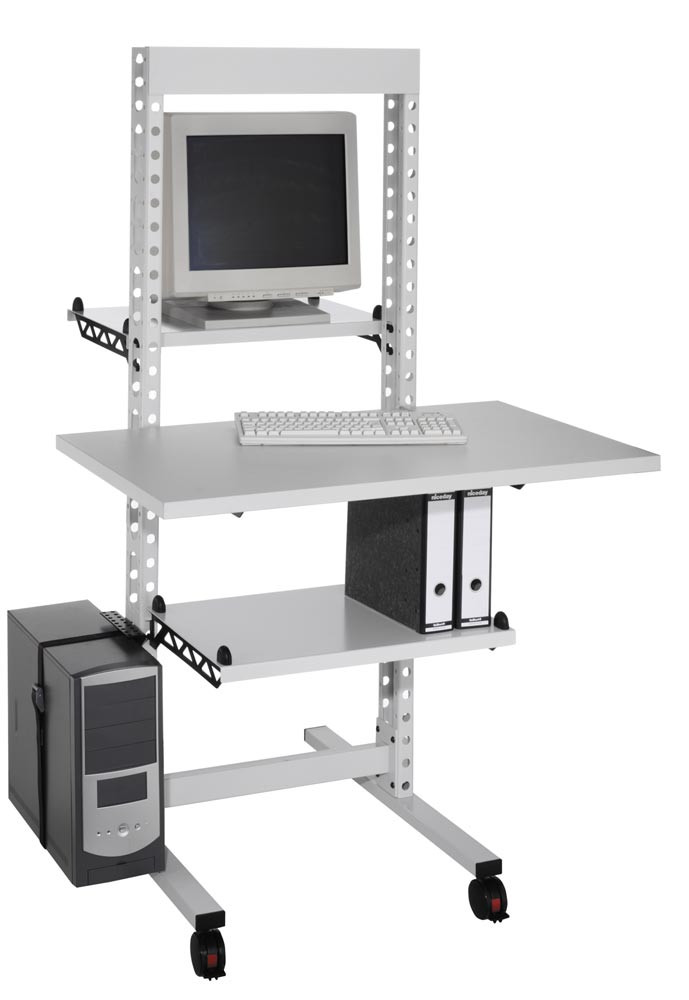 Version ∙ Stationen werden mit 4 Lenkrollen (Ø 75 mm; 2 mit Feststeller) geliefert ∙ Grundgestell ist eine stabile Rahmenkonstruktion aus Stahlprofilen, die zugleich als Kabelführung dienen ∙ Modularer Aufbau ermöglicht auch eine eigene Zusammenstellung der Konfiguration ∙ Die Tischplatten, Ablageböden sowie Schrank- und Schubladenmodule lassen sich, im 50 mm Raster, in der gewünschten Höhe sicher einhängen bzw. montieren · Korpus in RAL 7035 lichtgrau und Front in RAL 5010 enzianblau beschichtet