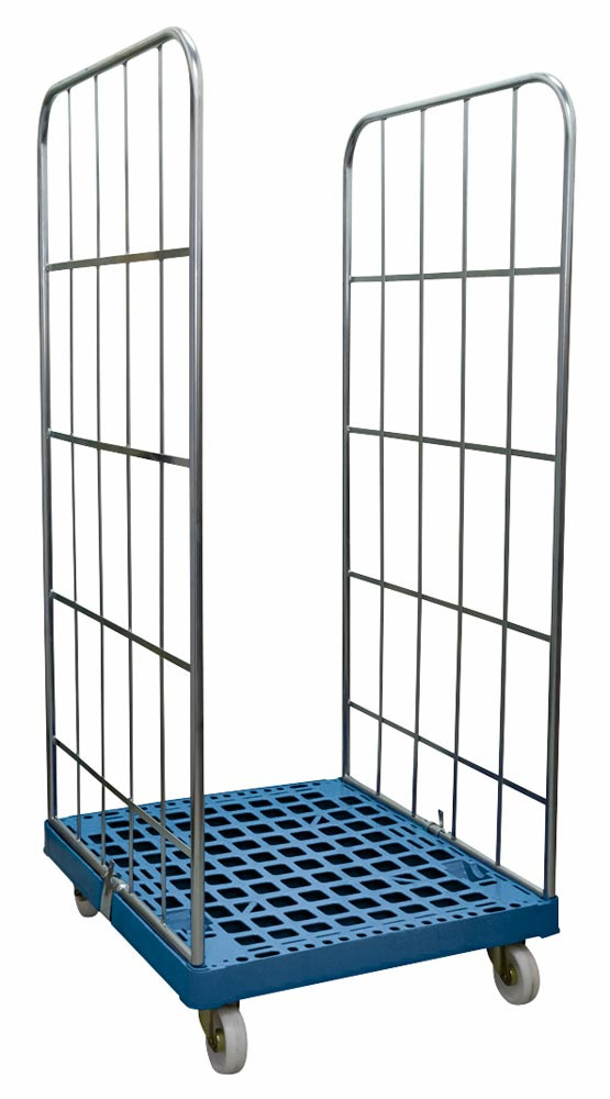 ∙ 2 Seitenwände, galvanisch blau verzinkt ∙ Robuste Rohrkonstruktion Ø 22 mm ∙ Ausfachungen mit 4 senkrechten und 4 bzw. 5 waagerechten Flacheisen 12 x 3 mm ∙ Bodenplatte mit 2 Lenk- und 2 Bockrollen Ø 108 mm aus Polypropylen mit Fadenschutz und verschraubter Radachse