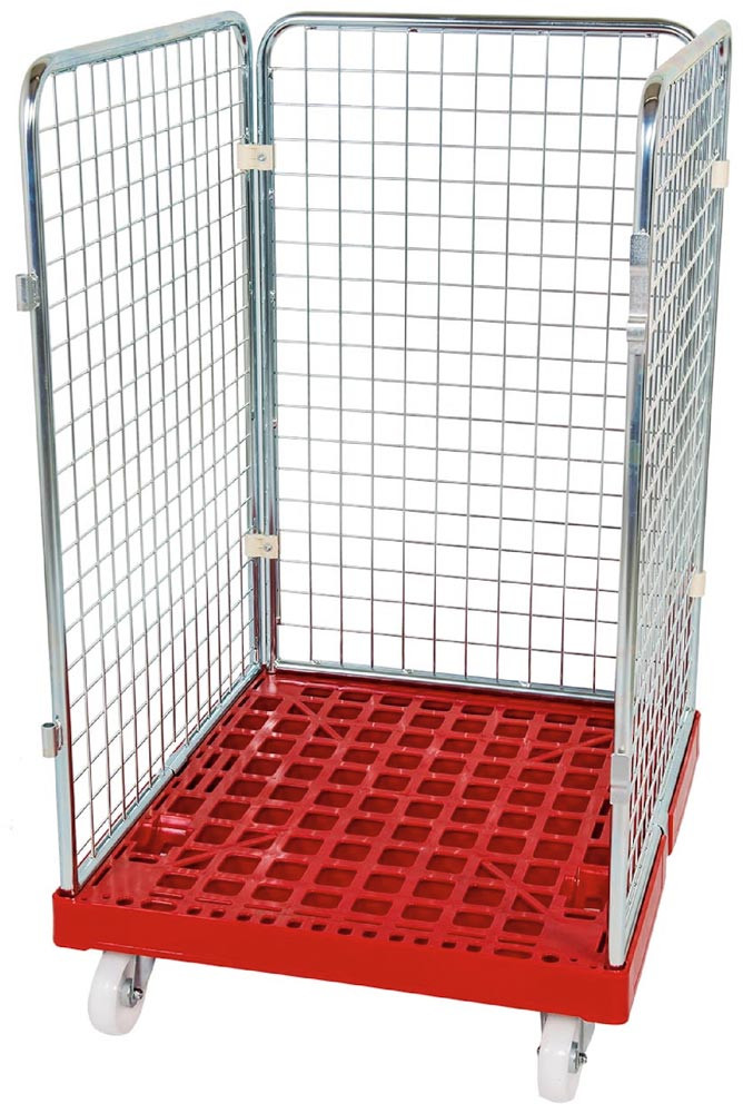 Rollbox mit Drahtgitterwänden, 3-seitig, Nutzhöhe 1020 mm, LxBxH 810x720x1200 mm, Bodenplatte aus HDPE, RAL 3000 feuerrot E1993096