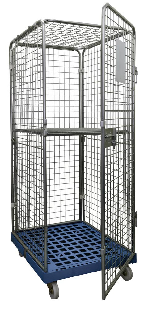 Rollbox mit Drahtgitterwänden, 5-seitig (1 Tür), 1 Boden, Nutzhöhe 1585 mm, LxBxH 810x720x1800 mm, Bodenplatte aus HDPE, RAL 5012 lichtblau E1979122