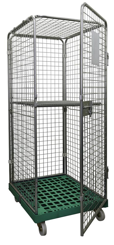 Rollbox mit Drahtgitterwänden, 5-seitig (1 Tür), 1 Boden, Nutzhöhe 1585 mm, LxBxH 810x720x1800 mm, Bodenplatte aus HDPE, RAL 6024 verkehrsgrün