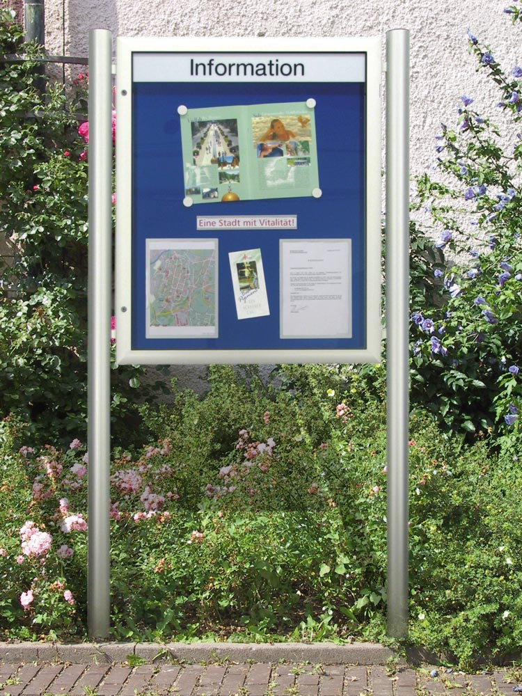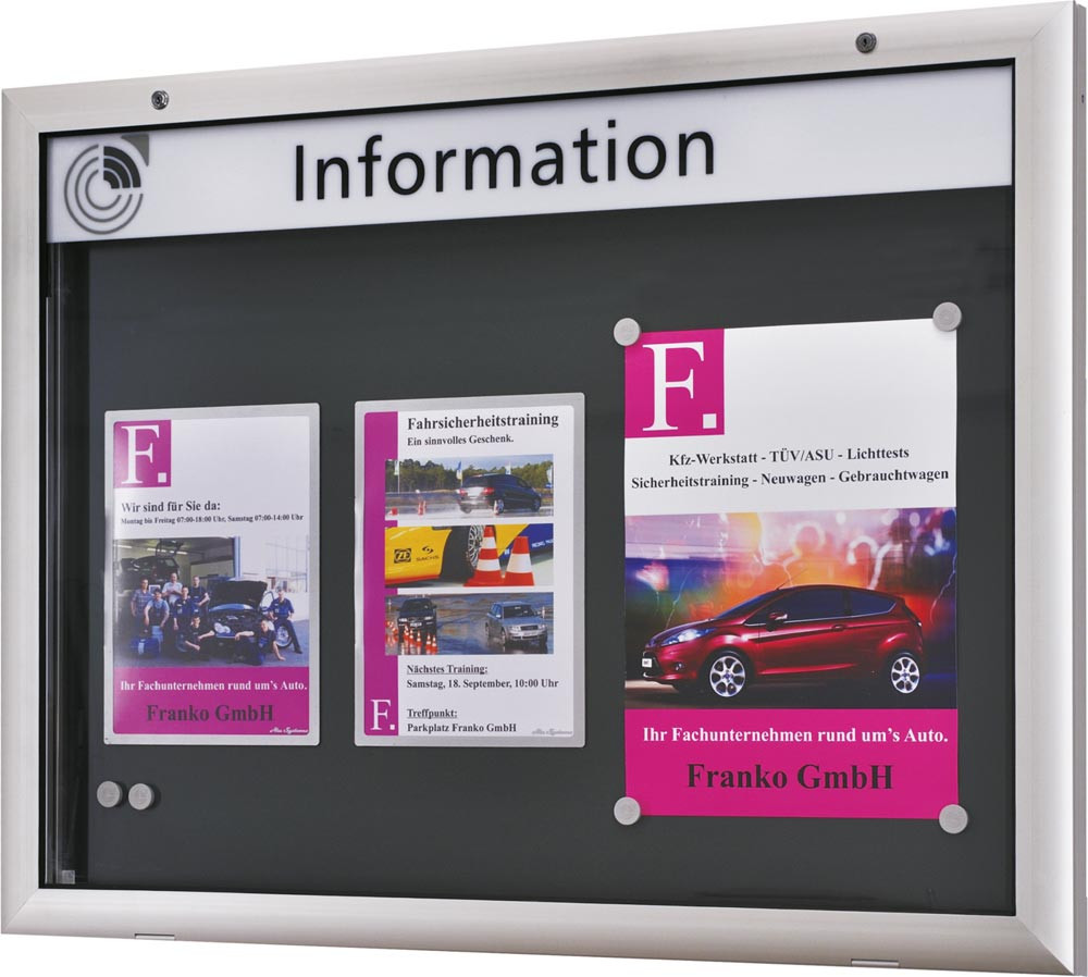 ∙ Formschöne Schaukästen die allen Anforderungen zum Informieren von Mitarbeitern, Kunden oder Mitbürgern entsprechen ∙ Wartungsfreie, korrosionsbeständige Aluminiumkonstruktion, silberfarbig eloxiert ∙ Flügeltür mit Einscheibensicherheitsglas (ESG) ∙ Abschließbar ∙ Regen- und staubdicht durch eckverschweißte Dichtungen ∙ Integriertes Belüftungs- und Entwässerungssystem ∙ Rückwand magnethaftend ∙ Entsprechend den Brandschutzbestimmungen B1 ∙ Für Wand- und Ständermontage ∙ Inkl. 10 Magnete grau und 1 Einstecktasche DIN A4 ∙ Lieferung ohne Schriftleiste oder Ständergarnitur (siehe Zubehör)