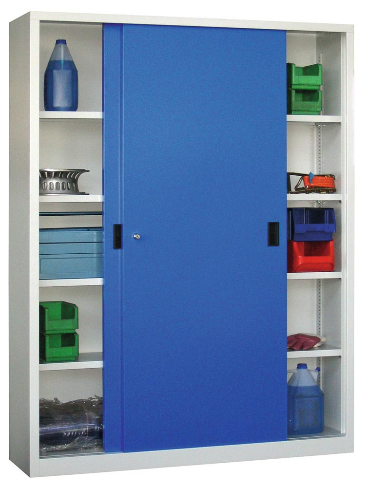 Schiebetürenschrank, Vollblechtüren, 4 verzinkte Böden, ohne Trennwand, BxTxH 1000x500x1950 mm, RAL 5010 E875885