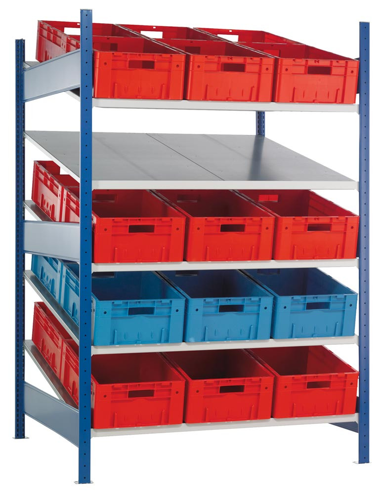 · Ideal für First-in-first-out-Läger, da Lagerware auf den 5 glatten, verzinkten Fachböden nachrutschen kann ∙ Direkter Einblick und einfacher Zugriff durch Schrägstellung der Böden ∙ 5 glatte, verzinkte Schrägböden erleichtern das Nachrutschen der Lagerware ∙ Vorderer Längenriegel 15 mm erhöht, verhindert das Heraufallen der Lagerware ∙ Längsversteifung durch Längenriegel ∙ Einschließlich Aushubsicherung ∙ Auf Anfrage auch als Doppelregal lieferbar