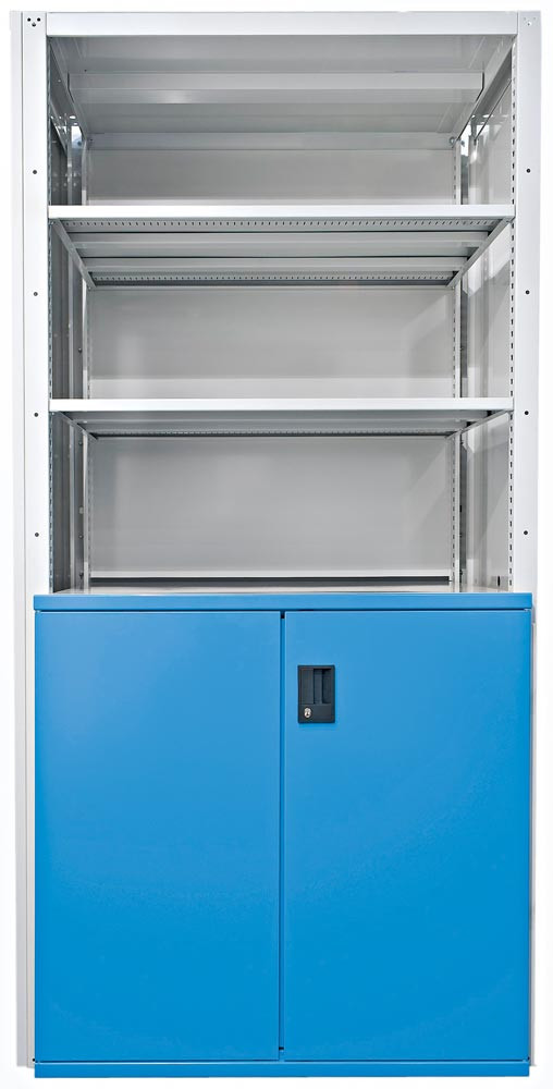 Schubladenregal, Grundfeld, 3 Universal-, 2 Verstell- + 2 Auszugböden, 1 Flügeltürpaar, BxTxH 1117x706x2 200 mm, RAL 7035/5012