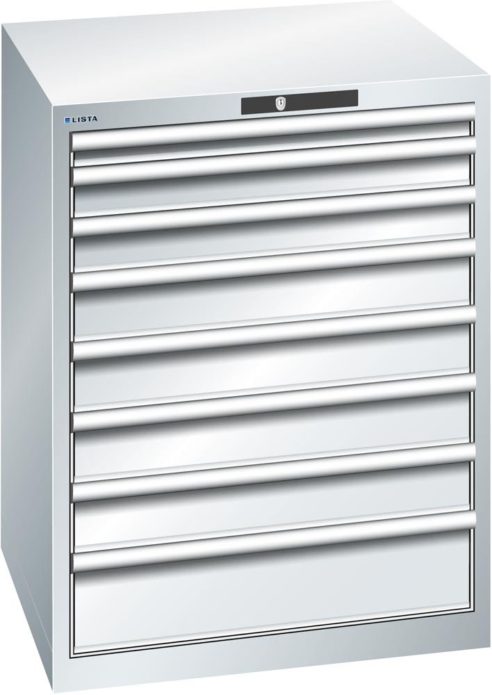 Schubladenschrank, Traglast/Schubl.: 75 kg, 8 Schubl.: 1x50, 2x75, 4x100, 1x150 mm, RFID-Schloss, BxTxH 717x725x850 mm, RAL 7035 E6409525