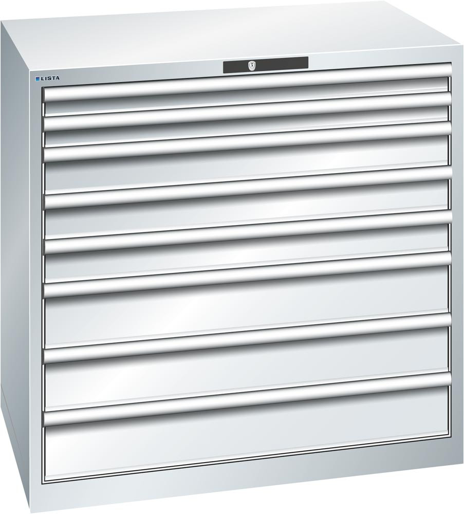 Schubladenschrank, Traglast/Schubl.: 200 kg, 8 Schubladen 2x75, 3x100, 3x150 mm, Zylinderschloss, BxTxH 1023x725x1000 mm, RAL 7035 E876431