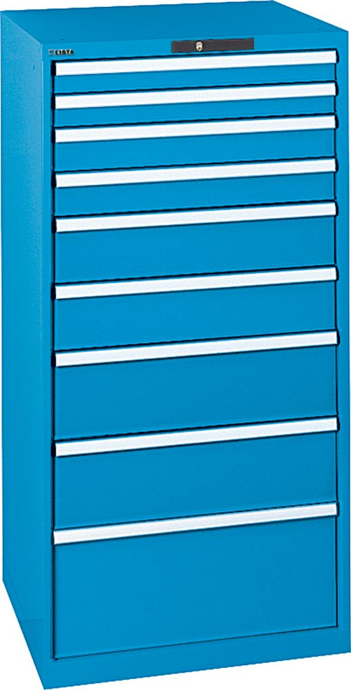 Schubladenschrank, Traglast/Schubl.: 75 kg, 9 Schubl.: 2x75, 2x100, 2x150, 2x200, 1x300 mm, Zylinderschloss, BxTxH 717x725x1450 mm, RAL 5012 E1615105