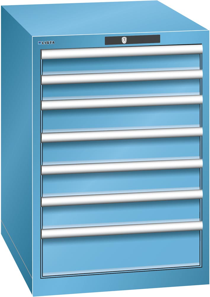Schubladenschrank, Traglast/Schubl.: 75 kg, 7 Schubladen: 2x75, 4x100, 1x150 mm, RFID-Schloss, BxTxH 564x725x800 mm, RAL 5012 E6409510
