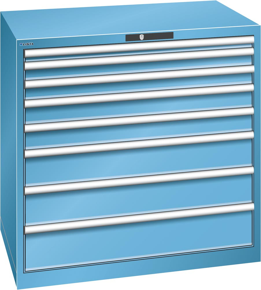 Schubladenschrank, Traglast/Schubl.: 200 kg, 8 Schubladen 50, 2x75, 2x100, 2x150, 200 mm, Zylinderschloss, BxTxH 1023x725x1000 mm, RAL 5012 E876428