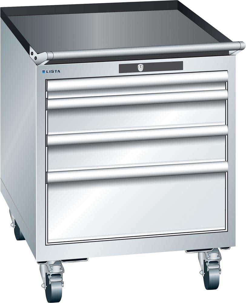 Schubladenschrank, Traglast/Schubl.: 75 kg, fahrbar, 4 Schubl.: 1x50, 2x100, 1x200 mm, RFID-Schloss, BxTxH 564x725x723 mm, RAL 7035 E6409515