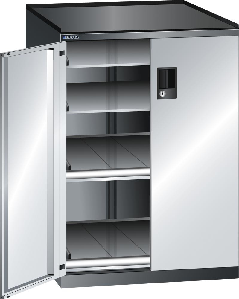 Schubladenschrank m. Flügeltüren, BxTxH 717x753x1020 mm, 2 Verstellböden u. 2 Auszüge 200 kg, Schloss, RAL 7035 E1986728
