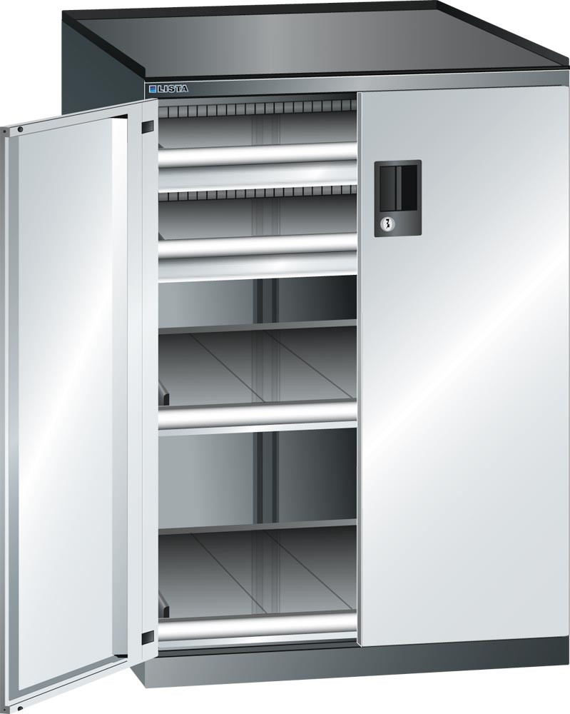 ∙Aus hochwertigen pulverbeschichteten Stahlblech ∙ Flügeltüren, einschlagend aus einem Stück gekantet, Öffnungswinkel 115 ° schließen bündig mit dem Gehäuse ab ∙ Inneneinrichtung in 25 mm Raster in der Höhe verstellbar ∙ Mit Zylinderschloss