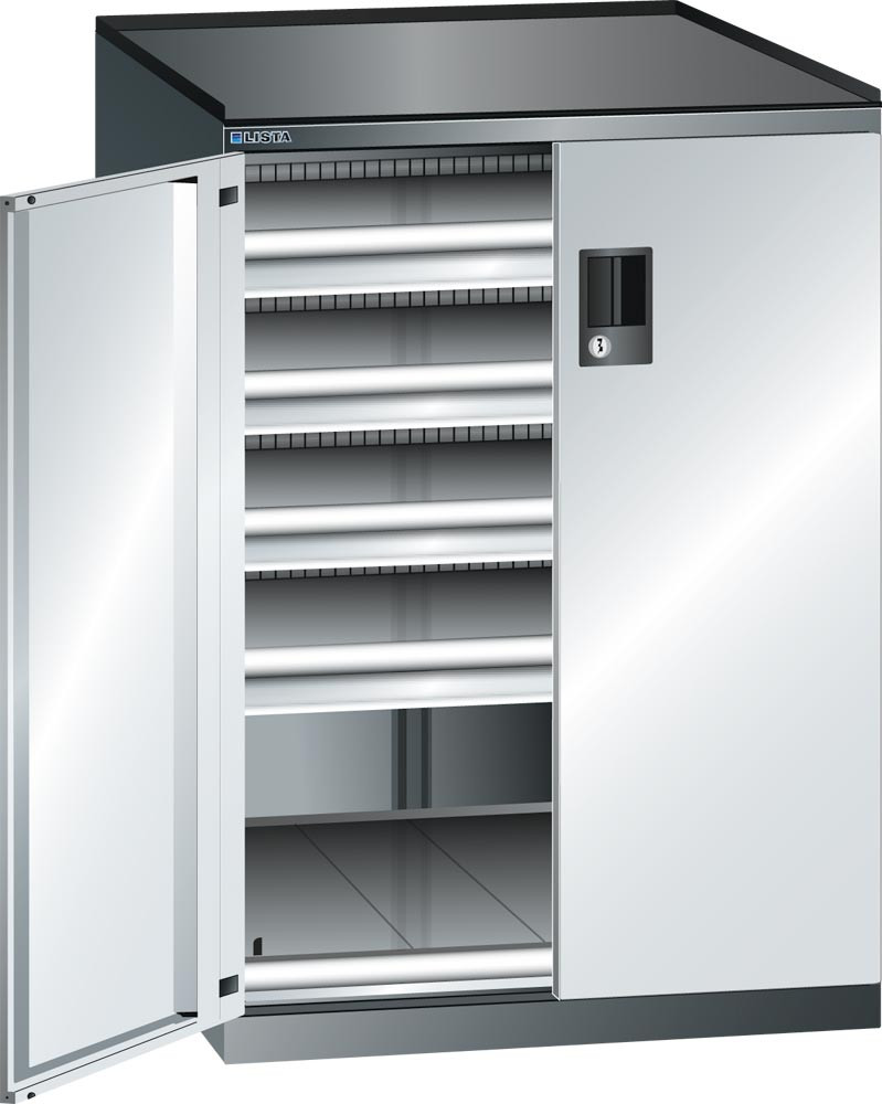 Schubladenschrank m. Flügeltüren, BxTxH 717x753x1020 mm, 4x75 Schubladen u. 1 Auszug 75 kg, Schloss, RAL 7035 E1986730