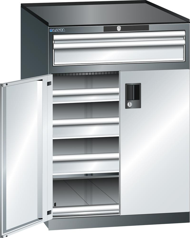 Schubladenschrank m. Flügeltüren, BxTxH 717x753x1020 mm, Schubladen: 1x50, 3x100, 1x75 u. 1 Auszug 75 kg, Schloss, RAL 7035 E1986738