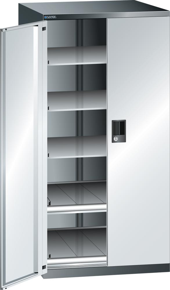 Schubladenschrank m. Flügeltüren, BxTxH 717x753x1450 mm, 3 Verstellböden u. 2 Auszüge 75 kg, Schloss, RAL 5012 E1986749