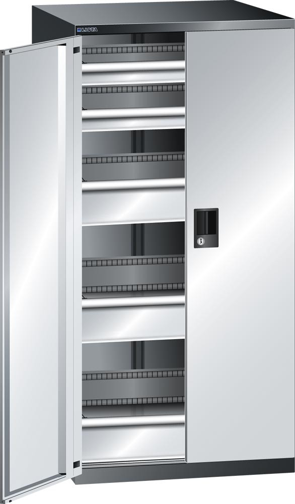 Schubladenschrank m. Flügeltüren, BxTxH 717x753x1450 mm, Schubladen: 2x75, 3x150 mm 75 kg, Schloss, RAL 7035 E1986754