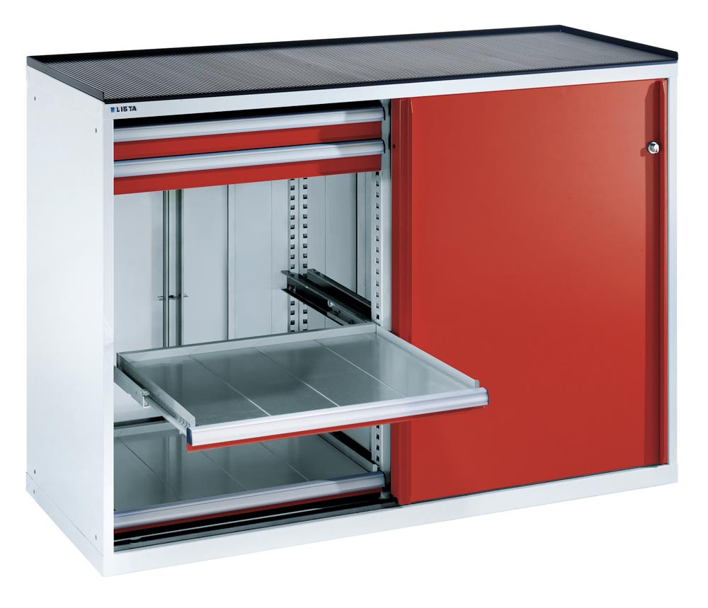 Schubladenschrank m. Schiebetüren, BxTxH 1430x627x1020 mm, 4 Schubladen 200 kg u. 2 Auszüge 200 kg, Schloss, RAL 5012 E1986769