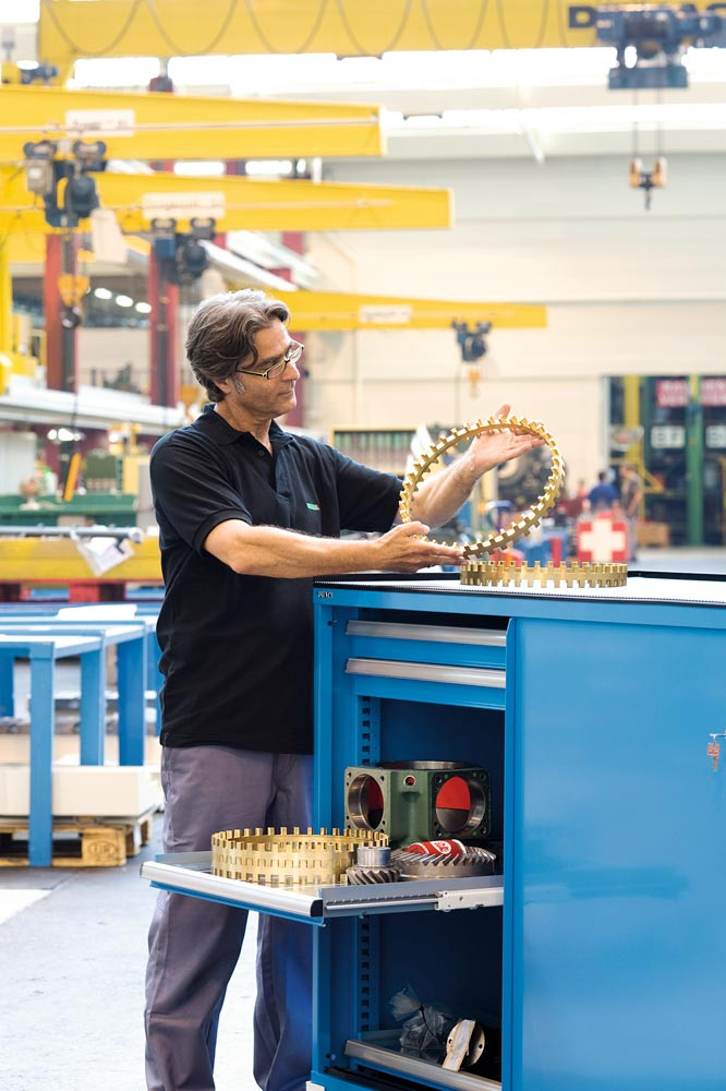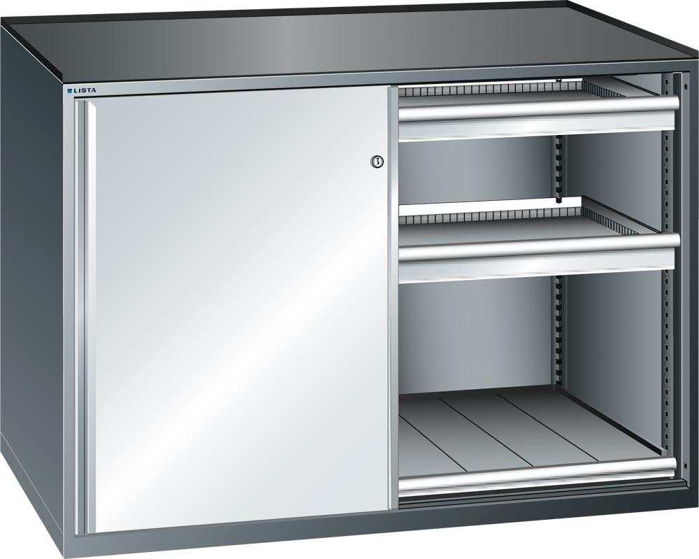 Schubladenschrank m. Schiebetüren, BxTxH 1430x627x1020 mm, 4 Schubladen 200 kg u. 2 Auszüge 200 kg, Schloss, RAL 7035 E1986770