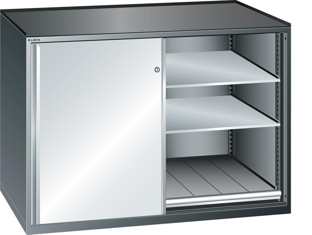 ∙ Aus hochwertigem, pulverbeschichtetem Stahlblech ∙ Optimal bei engen Raumverhältnissen ∙ Schiebetüren mit einer hohen Laufruhe ∙ Inneneinrichtung im 25 mm Raster in der Höhe verstellbar ∙ Mit Zylinderschloss ∙ Abrollrand 3-seitig inkl. Rillenmatte