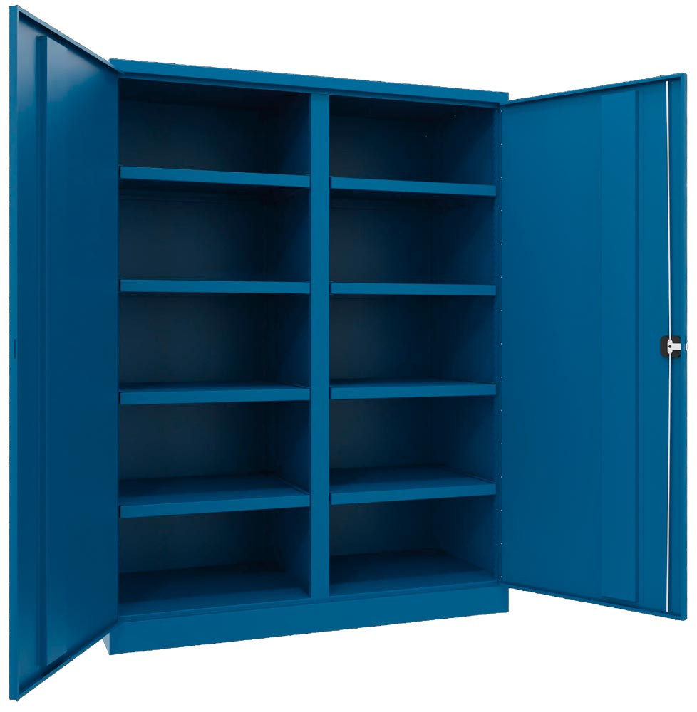 Schwerlastschrank, Vollblechtüren, m. Trennwand, 8 Böden, 120 kg Traglast, BxTxH 1470x630x1950 mm, RAL 5010