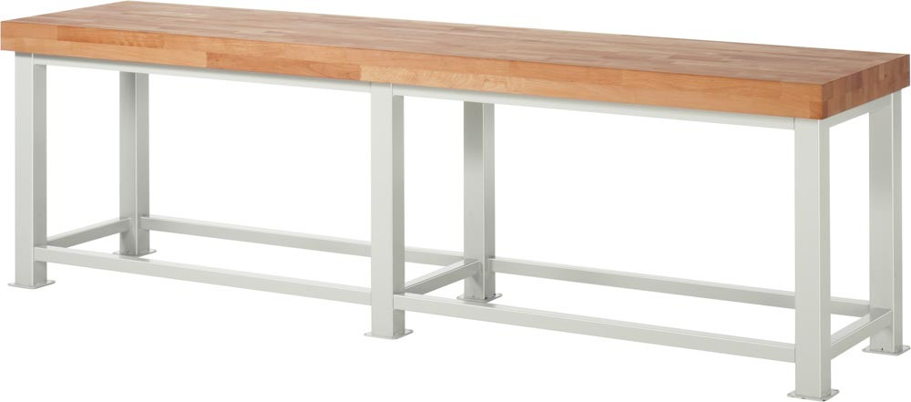 ∙ Buche-Massiv-Arbeitsplatte Stärke 100 mm · Oberflächenschutz durch umweltfreundliches Lackleinöl ∙ Stabile und verwindungsfreie Schweißkonstruktion aus Profilstahlrohr 80 x 80 x 3 mm mit Tiefenverstrebungen und Fußplatte (120 x 120 x 5 mm) mit Bodenverschraubmöglichkeit ∙ Querstreben aus Profilstahlrohr (45 x 45 x 2 mm) oben (vorne und hinten) ∙ Flächenlast 4500 kg ∙ Umweltfreundliche Pulverbeschichtung: Gestell RAL7035 lichtgrau