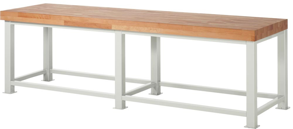 ∙ Buche-Massiv-Arbeitsplatte Stärke 100 mm · Oberflächenschutz durch umweltfreundliches Lackleinöl ∙ Stabile und verwindungsfreie Schweißkonstruktion aus Profilstahlrohr 80 x 80 x 3 mm mit Tiefenverstrebungen und Fußplatte (120 x 120 x 5 mm) mit Bodenverschraubmöglichkeit ∙ Querstreben aus Profilstahlrohr (45 x 45 x 2 mm) oben (vorne und hinten) ∙ Flächenlast 4500 kg ∙ Umweltfreundliche Pulverbeschichtung: Gestell RAL7035 lichtgrau