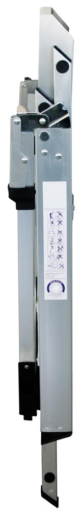 ∙ Kräftige Doppelholme ∙ Extra große Aluminiumstufen (205 x 360 mm) mit rutschfestem Stufenbelag ∙ Rutschfeste Leiterschuhe ∙ Mit nur einem Handgriff platzsparend zusammenklappbar