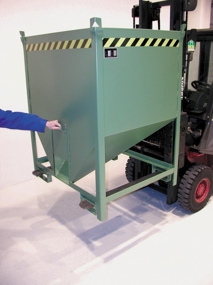 Silobehälter, LxBxH 1000x1200x1025 mm, Vol. 0,5 cbm, Traglast 750 kg, stirnseitiger Schieberverschluss, lackiert RAL 6011 resedagrün