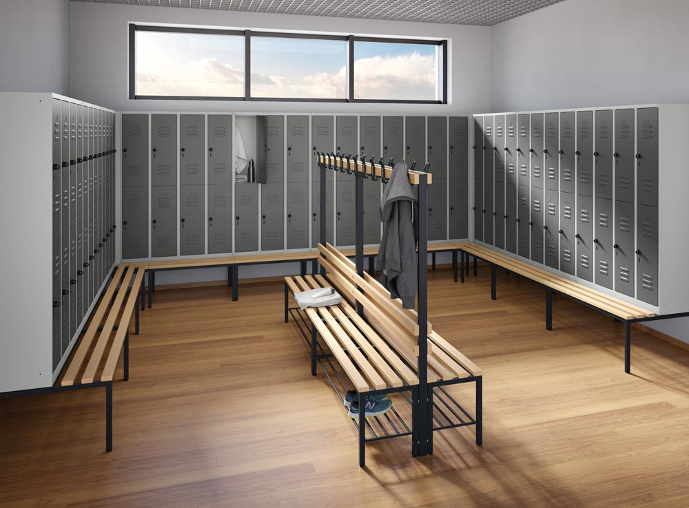 Doppelseitige Garderobenbank, Hartholzleisten, ohne Schuhrost, TxH 756x1710 mm, Länge 1000 mm, RAL 7021 E868968