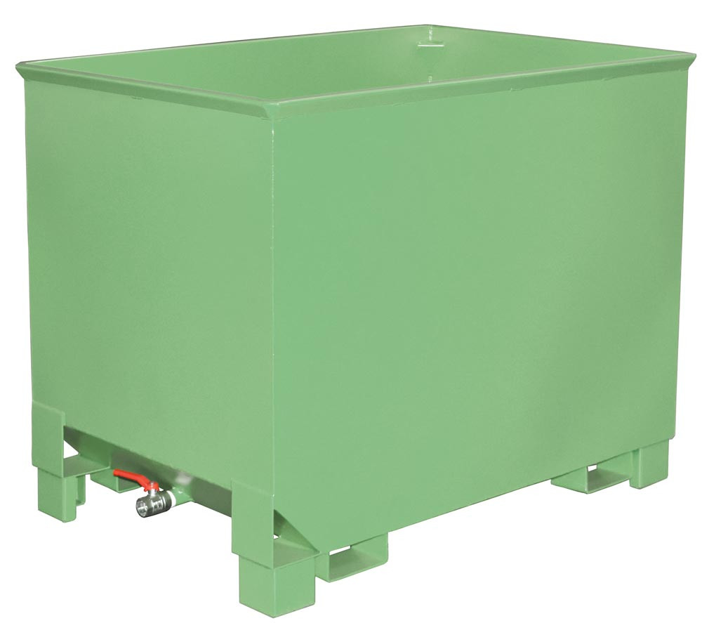 · Robuste Stahlkonstruktion mit glatten Innenwänden · Öl- und wasserdicht · 3-fach stapelbar auf 4 Stapelecken · Entleerung mittels Drehgerät