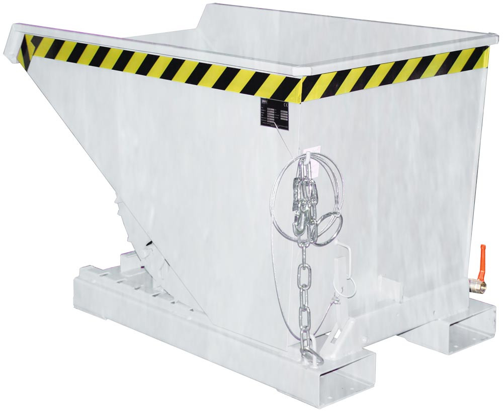 · Robuste Stahlblechkonstruktion, 3 mm Wannenblech mit umlaufend Randprofil · Siebblech und Ablasshahn 1" zum Trennen der Flüssigkeiten von Feststoffen · Öl- und wasserdicht · Günstiger Lastschwerpunkt · Kippen in jeder Höhe per Seilzug vom Staplersitz aus · Nach erfolgter Entleerung schwenkt der Behälter selbstständig in die Ladestellung zurück · Stabiler Grundrahmen mit Einfahrtaschen · Sicherung gegen Abrutschen und unbeabsichtigtes Auskippen