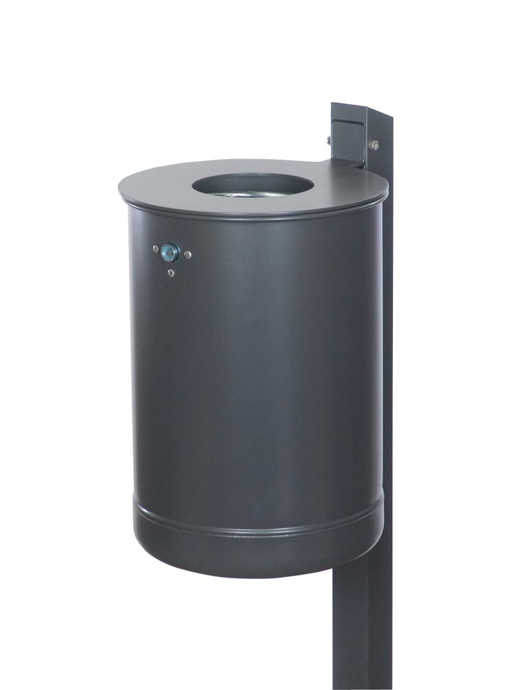 ∙ Behälter-Ø 380 mm, Höhe 515 mm, Deckelscheibe, Befestigungsschiene bzw. Befestigungspfosten aus hochwertigem, feuerverzinkten Stahlblech ∙ Auch mit Pulverbeschichtung erhältlich, Farbe nach Wahl ∙ Behälter wahlweise im gelochten oder ungelochten Design ∙ Inkl. Dreikant-Verriegelung und Metall-Dreikantschlüssel ∙ Lieferung inkl. Rechteckpfosten (60 x 60 x 1500 mm) mit Rundstahlanker zum Einbetonieren oder mit angeschweißter U-Profilschiene geeignet zur Wand- und Pfostenbefestigung ∙ Ohne Einsatzbehälter und Ascher