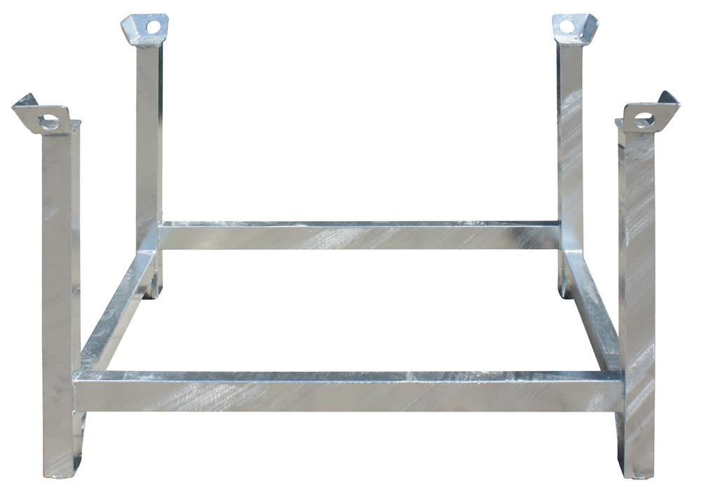 · Stahlblechkonstruktion mit profilierten Eckpfosten · Breite Füße und weite Stapeltaschen · Mit Kranösen · 3-fach stapelbar bei voller Last · Nutzhöhe 600 mm