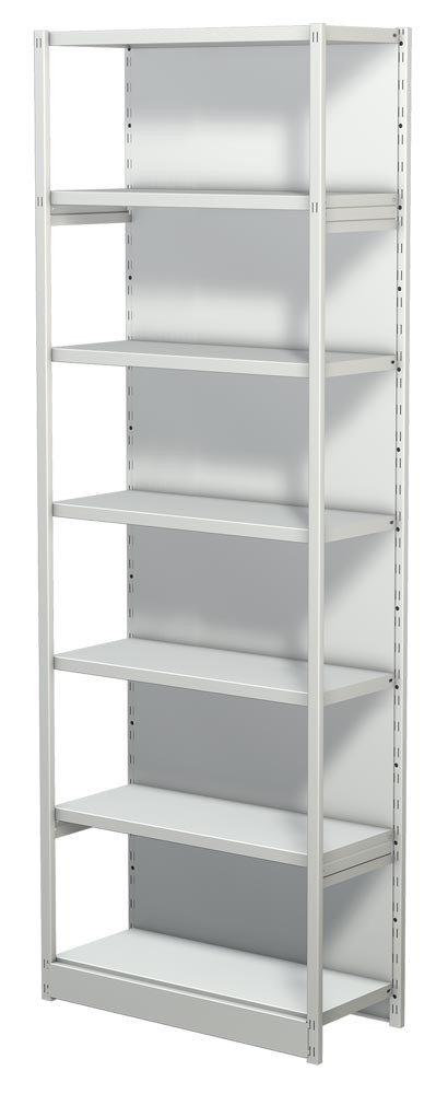 Steckregal mit Rückwand, Grundfeld, 7 Fachböden, 6 OH, BxTxH 750x300x2250 mm, lichtgrau