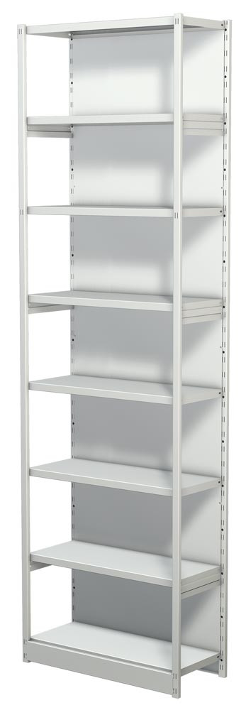 Steckregal mit Rückwand, Grundfeld, 8 Fachböden, 7 OH, BxTxH 750x300x2600 mm, lichtgrau