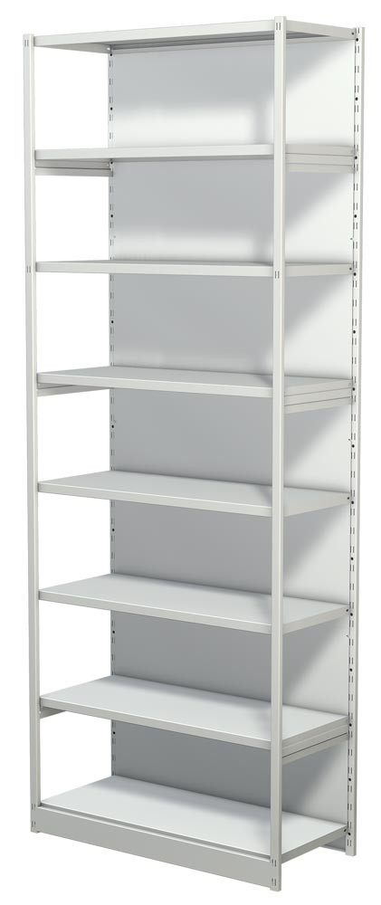 Steckregal mit Rückwand, Grundfeld, 8 Fachböden, 7 OH, BxTxH 750x300x2600 mm, lichtgrau E854475