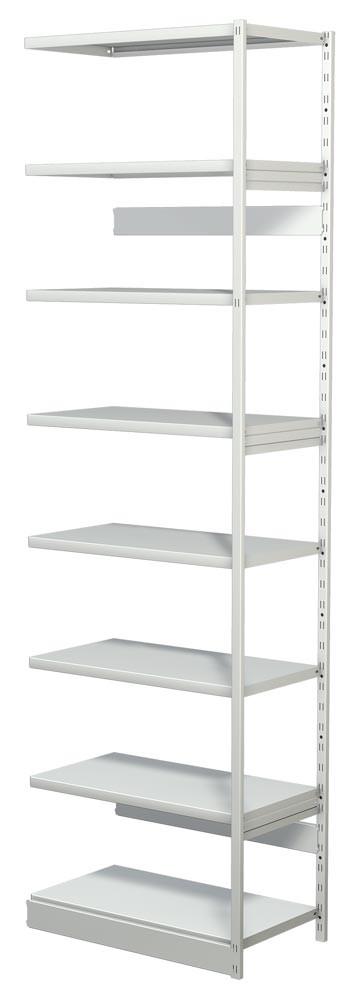 Steckregal ohne Rückwand, Anbaufeld, 8 Fachböden, 7 OH, BxTxH 960x300x2600 mm, lichtgrau E854419
