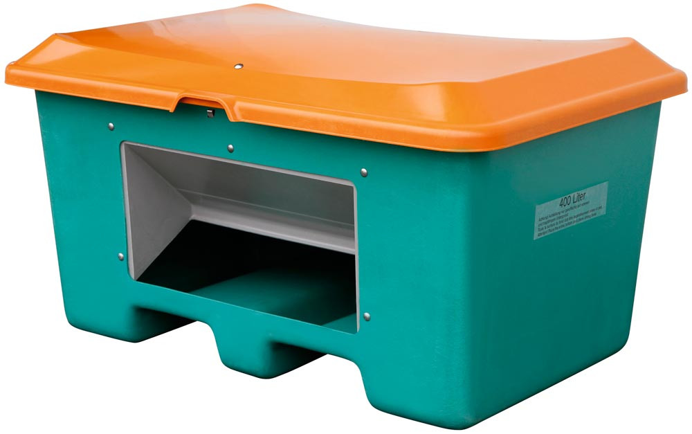 ∙ Für freistehende Aufstellung an allen Orten, wo sofortiger Einsatz von trockenem Streugut erforderlich ist ∙ Behälter aus glasfaserverstärktem Kunststoff GFK ∙ Seit Jahrzehnten bewährt ∙ Selbsttätig sichernder Schlosshaken aus Edelstahl ∙ Ab 400 l mit Stützstab für Deckel ∙ Deckelfarbe orange