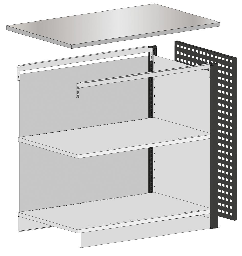 · Durch die Modulbauweise ist eine schnelle und einfache Konfiguration möglich · Jedes Modul wird standardmäßig mit 2 x 150 kg Fachböden und Sockelblende ausgeliefert · Die Fachböden sind im Raster von 25 mm in der Höhe verstellbar · Alle Module sind mit oder ohne Arbeitsplatte bestellbar · Sie können die Arbeitsplatten auch individuell bauseits beschaffen, z. B. für durchgehende Arbeitsplatten, eigene Abmessungen oder andere Oberflächen · Alle Module sind mit Frontblenden in der Farbkombination schwarz/lichtgrau ausgestattet · Die Module können optional mit einem Schubladenblock oder einer Regalschublade ausgestattet werden · Bei Bedarf sind die Theken nachträglich durch weitere Module erweiterbar