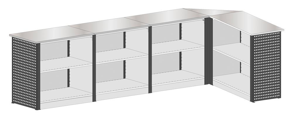 · Durch die Modulbauweise ist eine schnelle und einfache Konfiguration möglich · Jedes Modul wird standardmäßig mit 2 x 150 kg Fachböden und Sockelblende ausgeliefert · Die Fachböden sind im Raster von 25 mm in der Höhe verstellbar · Alle Module sind mit oder ohne Arbeitsplatte bestellbar · Sie können die Arbeitsplatten auch individuell bauseits beschaffen, z. B. für durchgehende Arbeitsplatten, eigene Abmessungen oder andere Oberflächen · Alle Module sind mit Frontblenden in der Farbkombination schwarz/lichtgrau ausgestattet · Die Module können optional mit einem Schubladenblock oder einer Regalschublade ausgestattet werden · Bei Bedarf sind die Theken nachträglich durch weitere Module erweiterbar