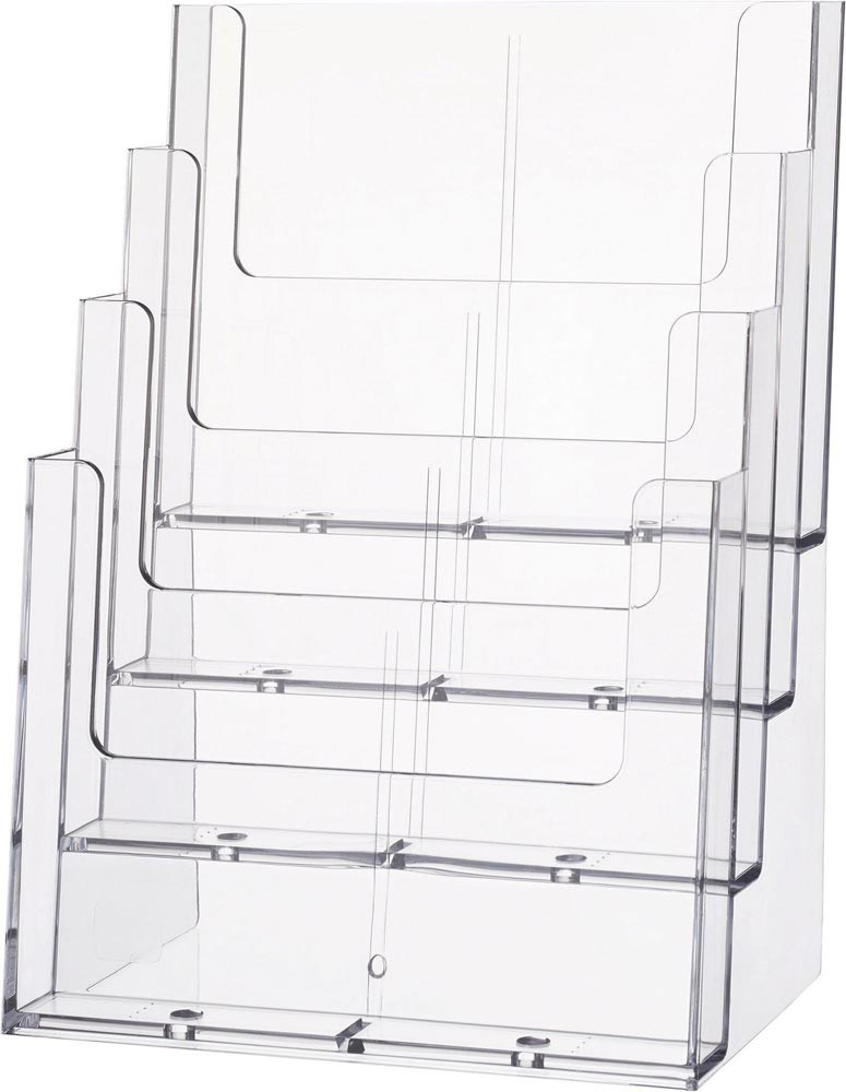 freistehend · Kunststoff glasklar · 4 Fächer für Prospekte im Format A4 hoch · zur Wandmontage geeignet