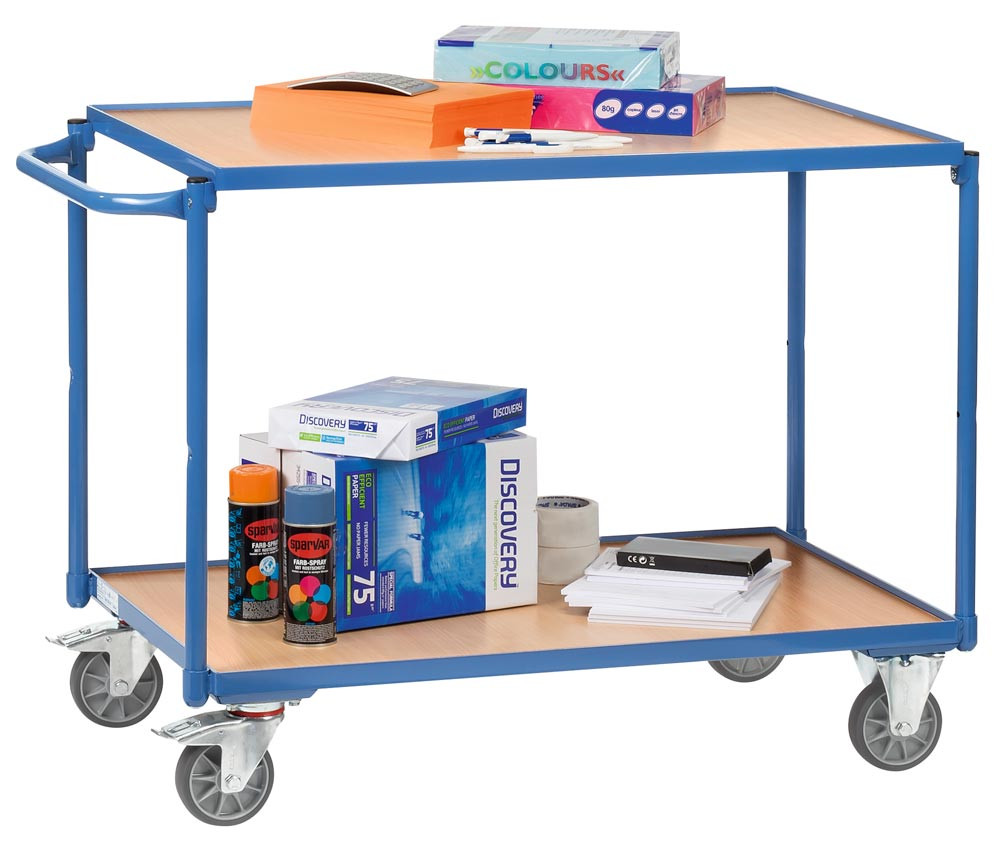 Tischwagen, 2 Ladeflächen LxB 1000x600 mm, Außenmaße LxBxH 1171x611x830 mm, waagerechter Schiebegriff, Traglast 300 kg, RAL 5007 brillantblau