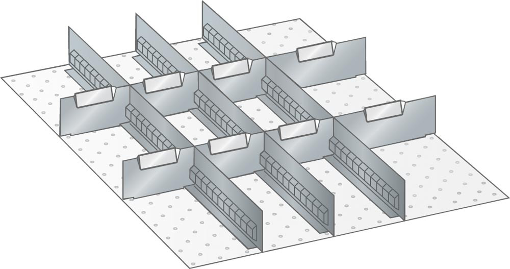 Trennwände, Fronthöhe 150 mm, 3 Schlitzwände 36E, 6 Trennbleche 6E, 2 Trennbleche 9E, Schubladennutzgröße BxT 459x612 mm
